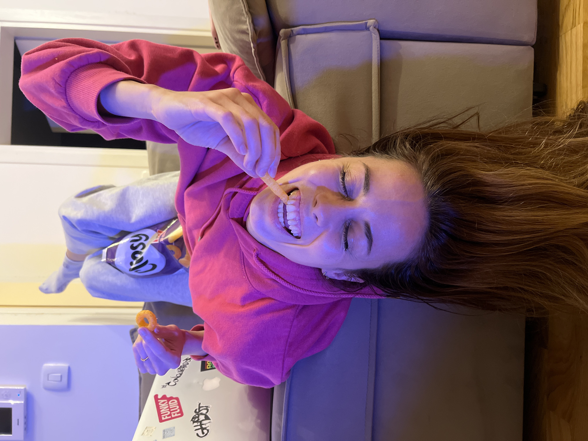 The scene depicts an indoor setting, identified as the city of Bar, Montenegro. A female individual, appearing to be a young adult, is positioned upside down on a light beige fabric sofa. She wears a hot pink hooded sweatshirt, light grey sweatpants, and white socks. Her long, two-toned brown hair hangs vertically towards the floor. She smiles broadly with closed eyes, revealing her teeth. Her right hand holds an orange, ring-shaped snack, while her left hand is in the process of placing a yellow-orange, stick-shaped snack into her mouth. A purple bag labeled "Crispy" containing snacks rests on the sofa near her legs. A silver laptop, adorned with stickers including "FUNKY FLUID" and "GHOST," is visible on the sofa to her left. The background features a white wall with a white light switch and a rectangular wall-mounted device, alongside a white doorframe. Wooden floorboards are discernible beneath her head. The environment is illuminated by a prominent blue/purple light, with a warmer, yellowish light source visible in the background.