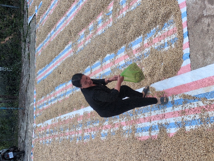 In Phát Chi, Vietnam, an adult female is observed outdoors, bent over a large area covered with light brown, ovular beans spread on tarpaulins for drying