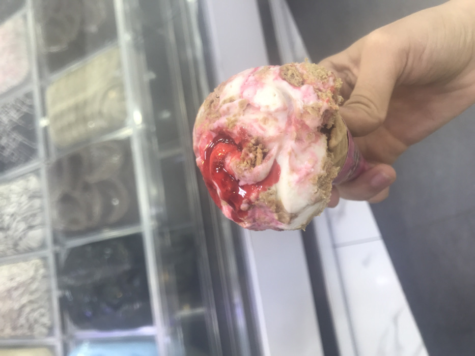 The image depicts a human hand holding an ice cream cone in an indoor setting, presumably an ice cream shop, within the city of Al-Qanawat Municipality, Syria