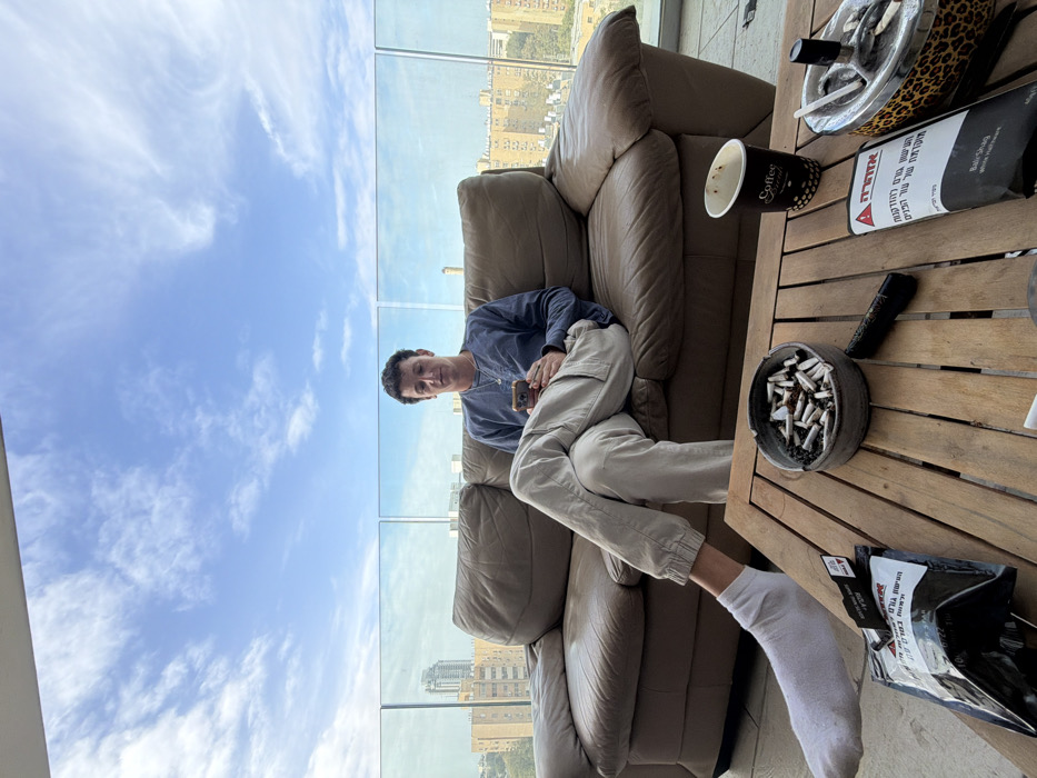 A male individual is observed on a high-rise balcony in Be'er-Sheva, Israel, under a partially cloudy blue sky
