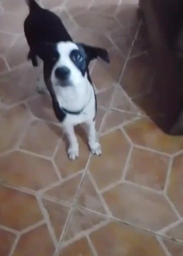 A full shot shows a medium-sized, black-and-white dog standing on a brown-tiled floor