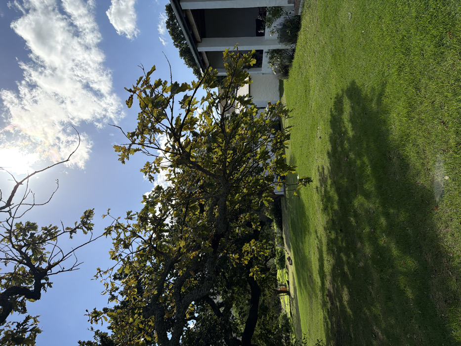 The scene depicts an outdoor daytime environment in Overstrand Nu, South Africa. A large, mature tree with dense green foliage occupies the left and central-upper portions of the frame, its branches extending across the sky. The sun is partially visible in the upper right, generating a lens flare and illuminating scattered white cumulus clouds against a clear blue sky. A manicured green lawn covers the foreground and midground, exhibiting pronounced shadows cast by the tree. To the right, a white single-story building with a covered veranda, supported by light-colored pillars and featuring exposed wooden ceiling beams, is present. A second, smaller white building is partially visible further back and to the left of the main structure. No individuals, animals, or explicit actions are observed.