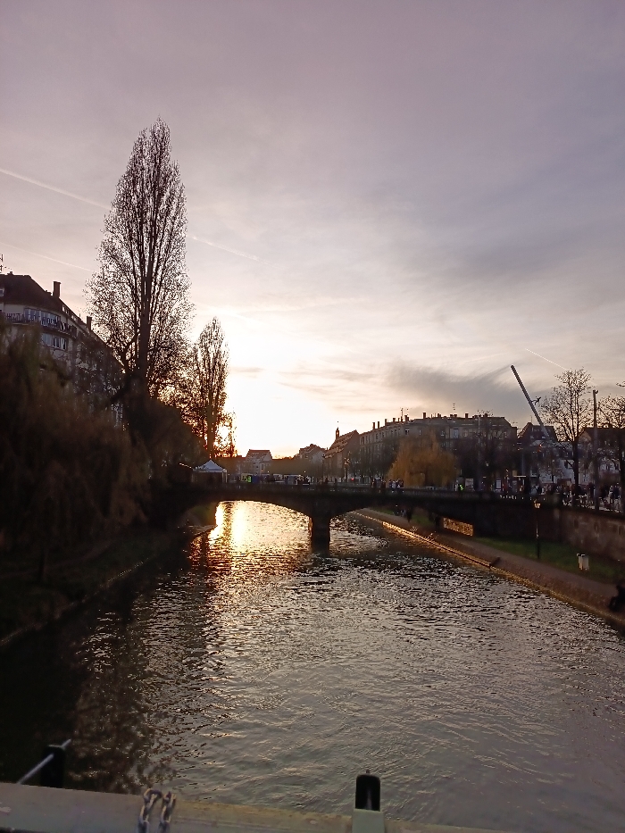 The image displays a river scene in Strasbourg, France, at either sunrise or sunset
