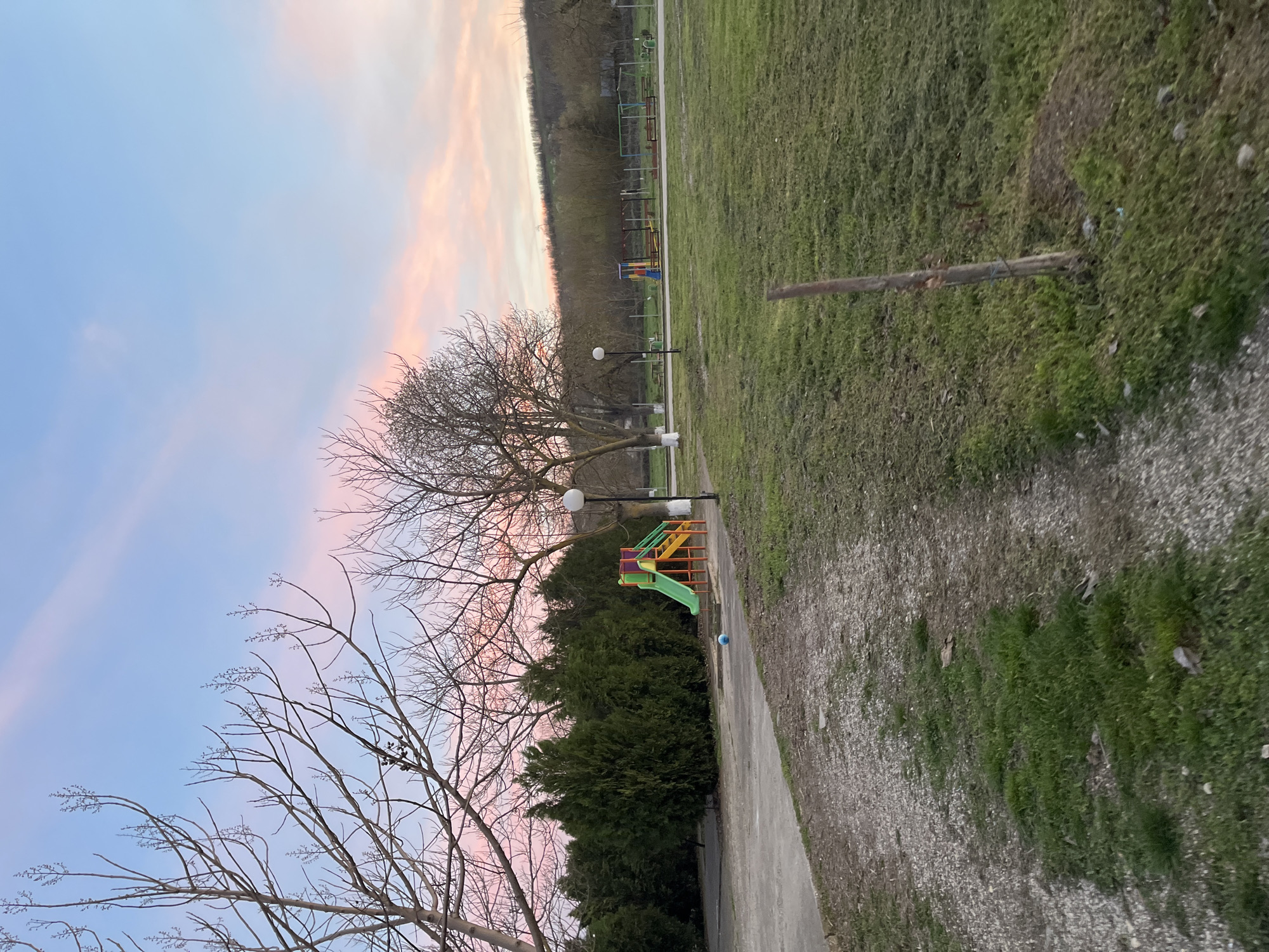 The image depicts a park setting, likely in Pozharevo, Bulgaria. A playground slide with green, yellow, and orange elements sits adjacent to a pathway. The path is bordered by green grass and some trees, one of which is bare. There are street lights along the path. Beyond the playground, there are more trees. The sky is predominantly blue with pink hues suggestive of either dawn or dusk.