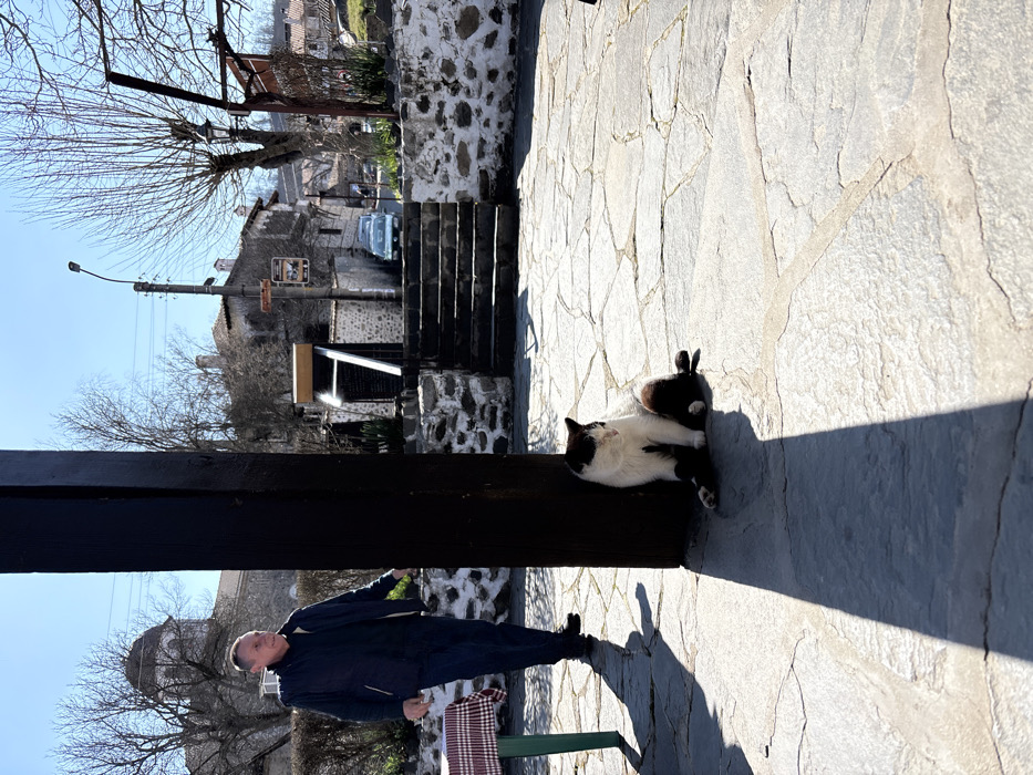 The scene depicts an outdoor paved area in Zlatograd, Bulgaria, under clear daytime conditions. A large, dark, square wooden pillar dominates the immediate foreground, casting a long, distinct shadow diagonally across the light gray flagstone pavement. To the left, a portion of a table with a red and white checkered tablecloth and green legs is visible. A black and white cat is seated on the pavement against the base of the dark pillar, its body angled slightly right, facing forward. The cat displays white fur on its chest, front paws, and face, with black fur covering its back, head, and hind legs. A male individual, appearing to be middle-aged, is walking from left to right behind the table and partially behind the pillar. He wears a dark blue jacket over a dark undershirt and dark trousers. His left hand is positioned near the pillar. His gaze is directed towards the right. In the mid-ground, beyond the paved area, a low stone wall supports a series of three to four stone steps leading upwards to the right. Beyond these steps, traditional two-story buildings constructed with stone foundations and lighter upper sections are visible. A prominent building on the far left features a dome-shaped roof. Bare deciduous trees, a utility pole, and a street lamp are present. A light blue, possibly vintage, vehicle is discernible on a street further in the background, between buildings. The sky is clear blue. Strong sunlight casts sharp, elongated shadows, suggesting a bright day.