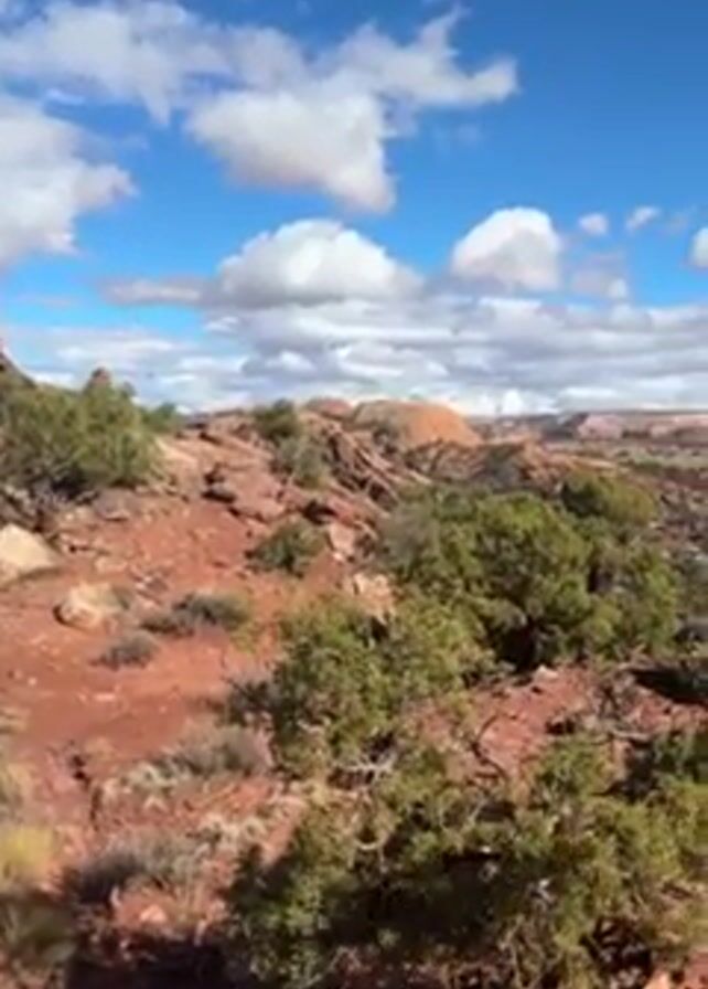 landscape with red rock formations and scattered green shrubbery under a blue sky dotted with white, puffy clouds