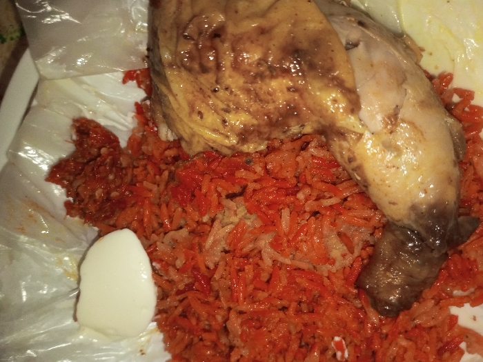 - "The image depicts a close-up view of a prepared meal, served on a white surface, likely a plate or a lined container, with crinkled transparent plastic visible beneath and around the food" by FM-DhZcv1, licensed under CC BY 4.0