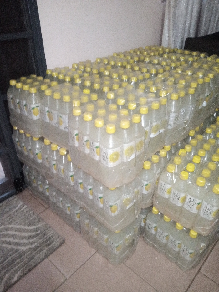 The image depicts an indoor scene showcasing a substantial quantity of bottled lemonade