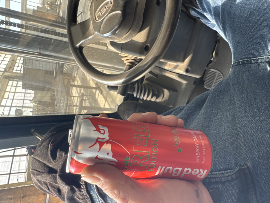 A person's right hand, showing signs of manual labor, holds an opened red Red Bull "The Red Edition Watermelon" energy drink can. The individual is seated inside the cabin of an industrial vehicle, likely a forklift, as indicated by the visible "HELI" branded steering wheel to the right and a ribbed foot pedal on the floor. The person's legs are clad in blue jeans, with a dark, crumpled fabric resting on the left thigh. Through the vehicle's front window, a brightly lit industrial workshop or warehouse is visible, featuring large, multi-paned windows, metal structural elements, worktables, and faint figures of other individuals in the distance. This scene is situated within an industrial facility in Pleven, Bulgaria.