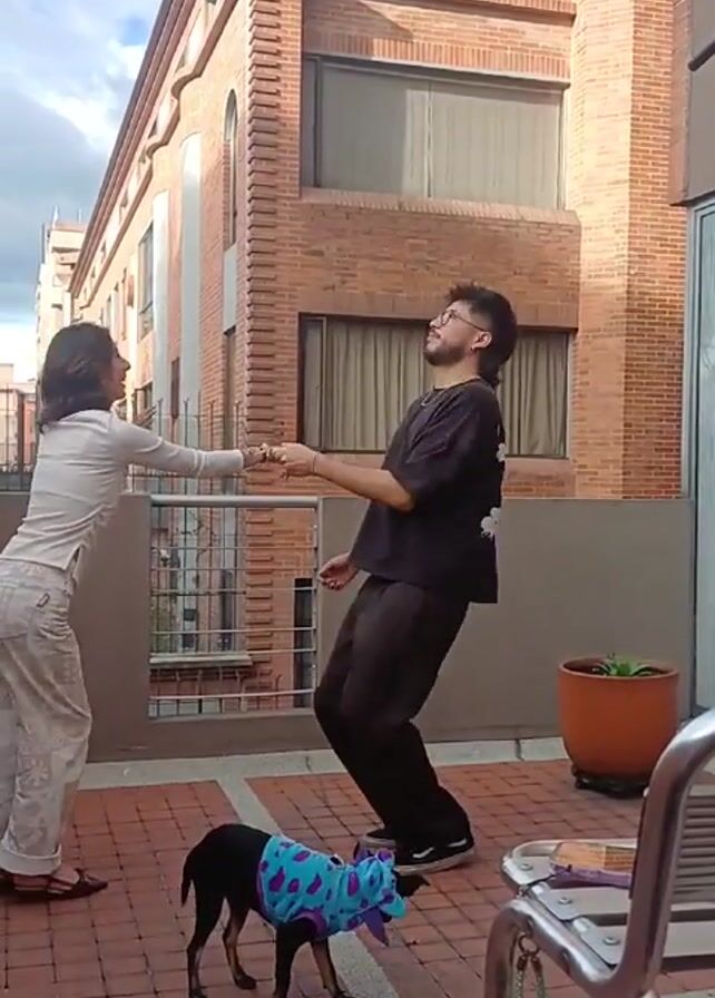 On a sunny rooftop patio paved with red bricks, a slender woman in light-colored patterned pants and a cream-colored long-sleeved shirt is dancing with a taller man with a mullet, glasses, and a black outfit. They are holding hands and move gracefully in a side-by-side embrace. A small, black dog wearing a blue and purple patterned jacket sniffs the ground near their feet. Behind them, a brick building with tall windows fills the background. A potted plant and a metal patio chair are also visible in the scene. The sky is partly cloudy.
