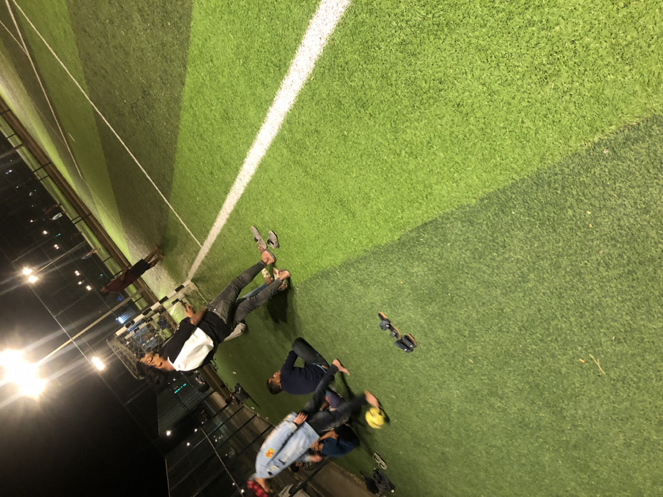 A group of people are on an astroturf field, possibly a soccer field, as suggested by the presence of a goal. One person is lying down near a white line, while others are sitting or standing around. The artificial grass varies in shade, creating a striped effect. The background suggests a nighttime setting with lights and possibly buildings visible.
