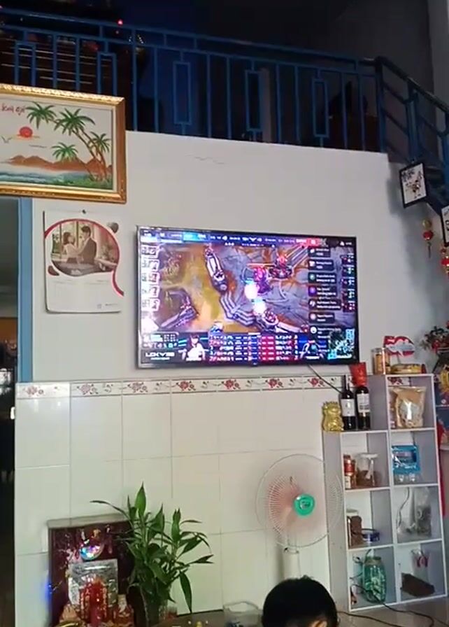 The scene is indoors, in a room with tiled walls and a blue staircase. On the wall is a large, vertical screen displaying an animated, brightly colored video game. Below the screen are decorative items: a framed picture of a palm tree, a calendar, and a plant with religious ornaments. A white electric fan is also mounted on the wall. A person is partially visible on the right side of the frame, seemingly engaged with something out of view. The room is cluttered, with shelves holding various items and decorative objects hanging from the ceiling.
