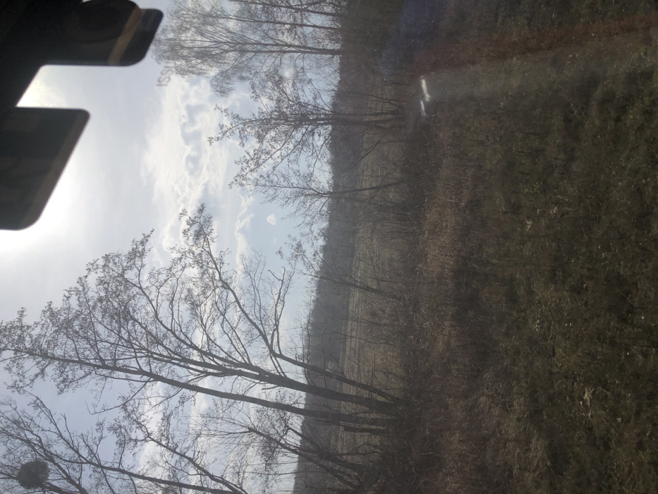 The image depicts an outdoor, rural landscape in Steinbourg, France, observed through a reflective surface, likely a vehicle window. The sky is partially cloudy with a light blue hue and scattered white cumulus clouds. A prominent light source, consistent with the sun, is positioned in the upper right, causing significant glare and lens flare effects in the upper and lower right portions of the frame. The foreground consists of dry, brown, and yellowish-green dormant vegetation, indicative of grass and sparse undergrowth. Beyond this, a light brown field, possibly fallow agricultural land, extends into the midground. A line of numerous deciduous trees, mostly bare-branched, is silhouetted against the sky. These trees vary in height, with taller specimens on the left and a denser concentration of smaller trees and shrubs in the mid-right. A dark, spherical object, consistent with a bird's nest or mistletoe clump, is visible in the upper branches of a tree on the far left. Trees with lighter bark, possibly birches, are present on the far right. In the upper right corner, a dark, indistinct structural reflection or physical object is visible. Below this, an inverted, semi-transparent reflection of the text "ISSU" is discernible on the viewing surface. Bright light streaks and flares are present in the lower right and mid-right, consistent with reflections or light passing through glass. No people or animals are present, and no specific actions or interactions are depicted. The overall environment suggests a natural, undeveloped or agricultural area during late winter or early spring.