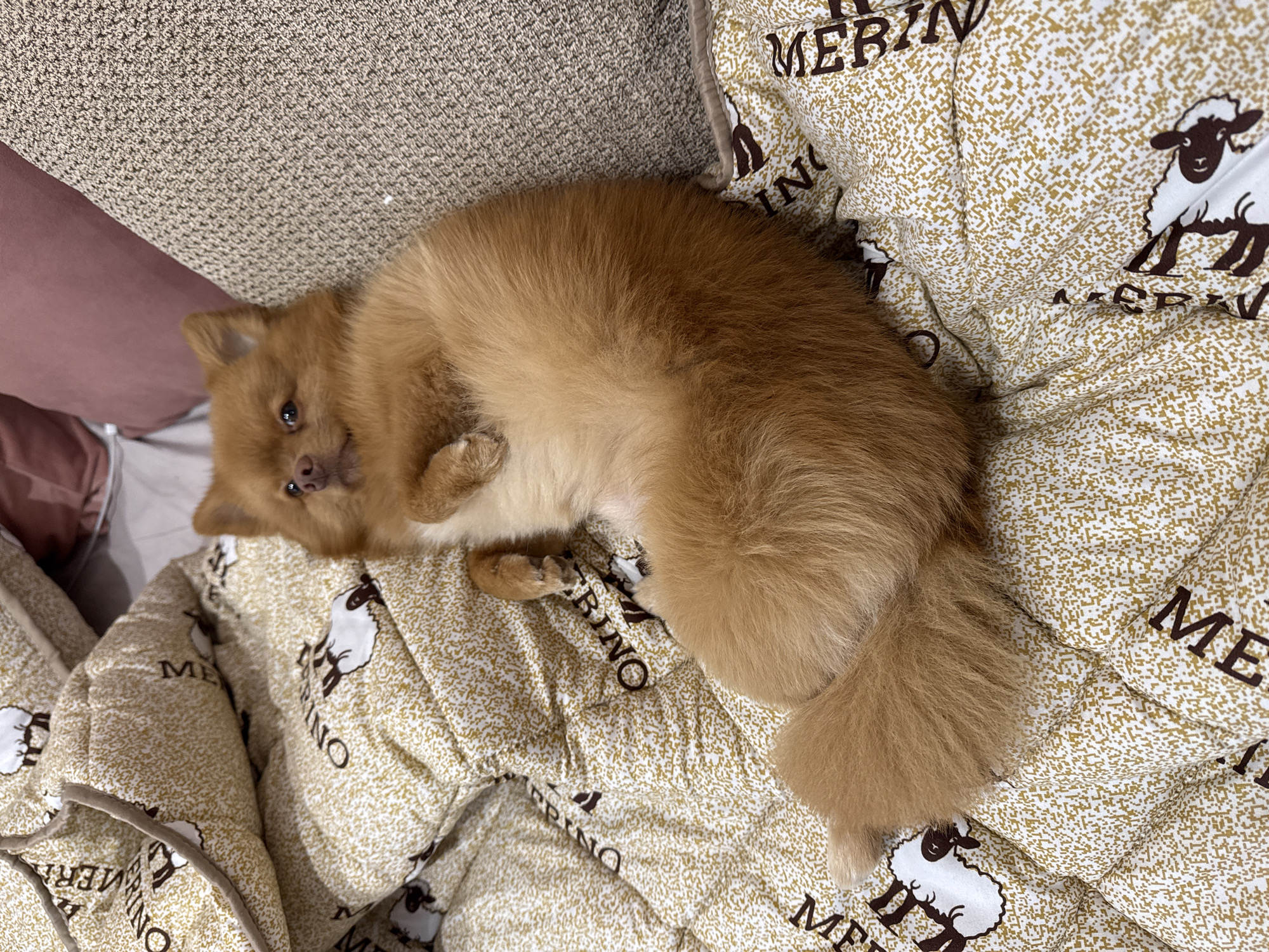 A small, golden-brown dog is lying on its side on a patterned blanket. The blanket is beige and white with a repeating motif of sheep and the word "MERINO". The dog is positioned near the edge of the blanket, with part of its body obscured by a beige cushion or sofa. The dog is looking directly at the camera. There is no information about Zhiten, Bulgaria.