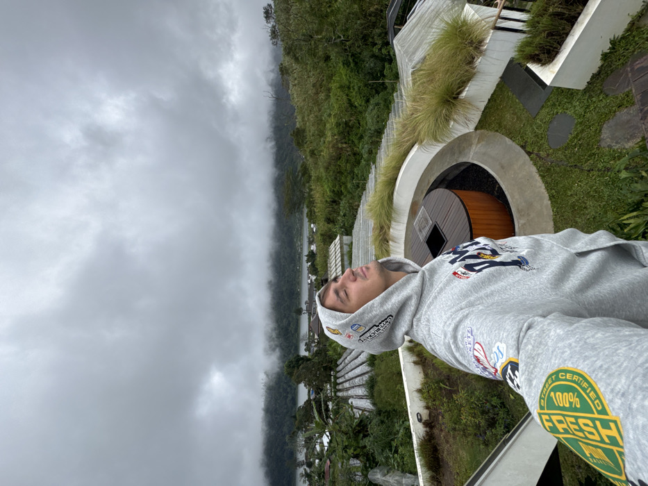 A man wearing a gray hoodie with patches lies on a patio. The patio features a circular structure with a wooden roof, surrounded by grass and planter boxes. In the background, a misty mountain and lake are visible beneath a cloudy sky. The photo is taken at an angle, making the scene appear tilted.