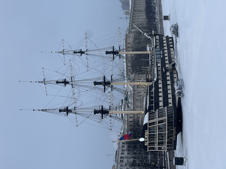 - "The scene depicts the multi-masted sailing ship replica 'Blagodat' (БЛАГОДАТЬ), operating as the 'Restaurant' (РЕСТОРАН), moored on a snow-covered, frozen river in Saint Petersburg, Russia" by FM-6LnVy2, licensed under CC BY 4.0