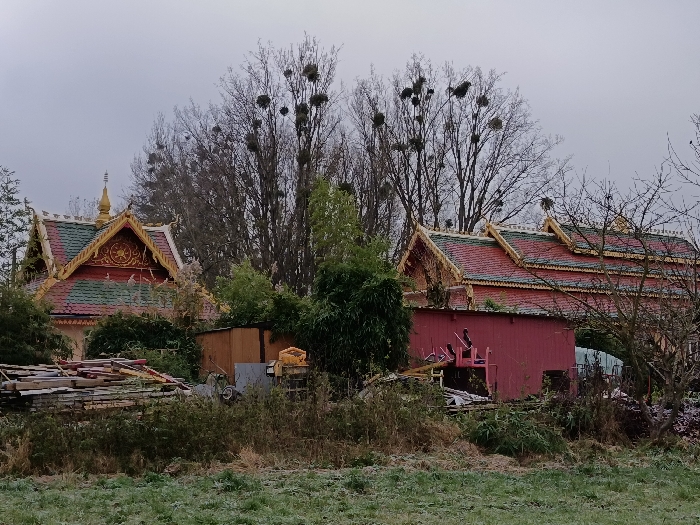 This image depicts an outdoor scene in Souffelweyersheim, France, under an overcast, light grey sky. The foreground consists of sparse, frosted green grass. Beyond the grass, dense, wild vegetation, including shrubs and bamboo-like plants, partially obscures two structures featuring Southeast Asian architectural elements. The leftmost structure presents a red tiled roof with green sections, adorned with intricate gold-colored eaves and a central gable displaying a circular emblem beneath a golden spire. To its right, a second structure exhibits a multi-tiered red tiled roof with matching gold trim, extending over a reddish-brown wooden lower section. A light brown wooden shed is situated between these two main structures. In the mid-ground, to the left, a substantial stack of raw wooden planks is present. Various pieces of outdoor equipment and debris, including a yellow machine, are scattered amongst the vegetation near the buildings. The background is dominated by tall, leafless deciduous trees, heavily populated with numerous large clumps of mistletoe. No individuals, specific actions, or interactions are discernible within the frame.