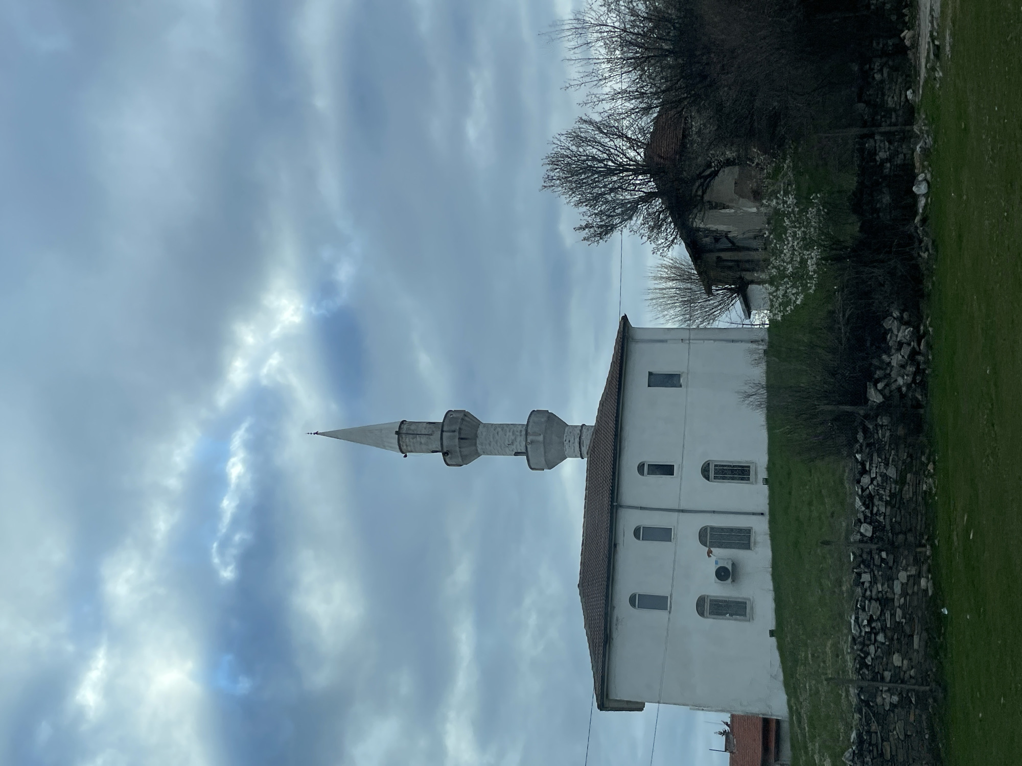 white building with a minaret against a cloudy sky. The building appears to be a mosque, given the presence of the minaret. The building is white, with a red-tiled roof and arched windows. There is an air conditioning unit visible on the wall. The minaret is a tall, slender tower with two prominent bulbous sections. The surrounding area includes green grass, a stone wall, and a few trees. In the background, there is a dilapidated structure. The image appears to be taken in a rural or suburban setting. The location is likely near Kardzhali, Bulgaria.