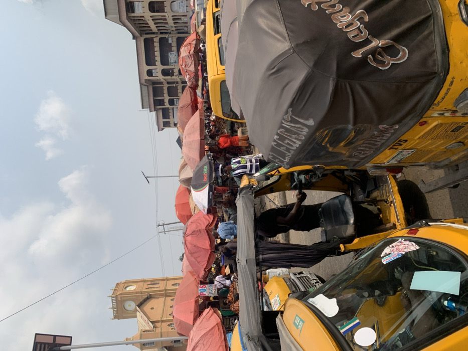 This image depicts a bustling street market scene in Lagos, Nigeria, specifically near St