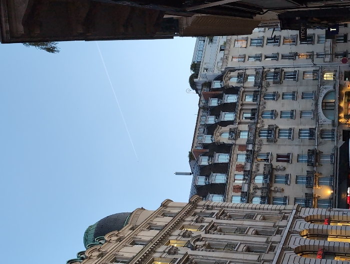 The image depicts a Parisian street scene at dusk, dominated by ornate Haussmannian architecture under a clear, light blue sky. A single white aircraft contrail extends diagonally across the upper sky. On the left, a grand, multi-story building features a light stone facade with extensive classical ornamentation, multiple windows, and a prominent dark green, possibly copper, dome on its upper left corner. The ground floor displays illuminated windows, with partial signage visible, including "MONT B" (likely Montblanc) and "ROYAL." In the center, a beige-toned Haussmannian building rises, characterized by a dark grey mansard roof with numerous dormer windows, several floors with ornate wrought-iron balconies, and an arched entrance at street level. Some windows show warm interior illumination. Rooftop elements include a vertical antenna or vent and some greenery. To the far right, a darker, indistinct structure partially frames the scene. Behind it, a lighter building with balconies and illuminated windows is visible. A small branch with green leaves hangs into the frame from the top right corner. Street signs are discernible, including "mai" and a dark blue sign with a white "T." No individuals or vehicles are clearly present in the frame. The architectural style and prominent buildings are characteristic of central Paris, likely near the Boulevard Haussmann or Opéra district.