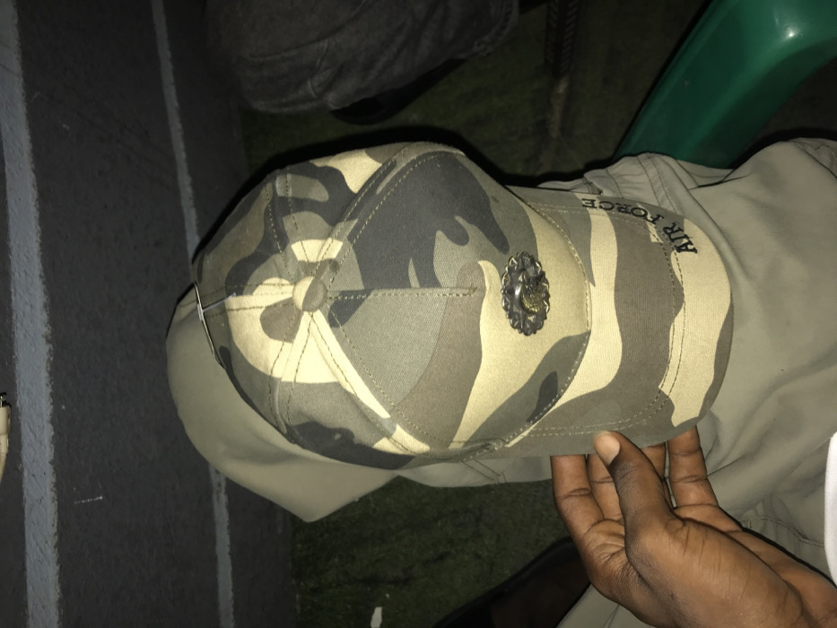 A camo-patterned "Air Force" baseball cap sits on a person's lap