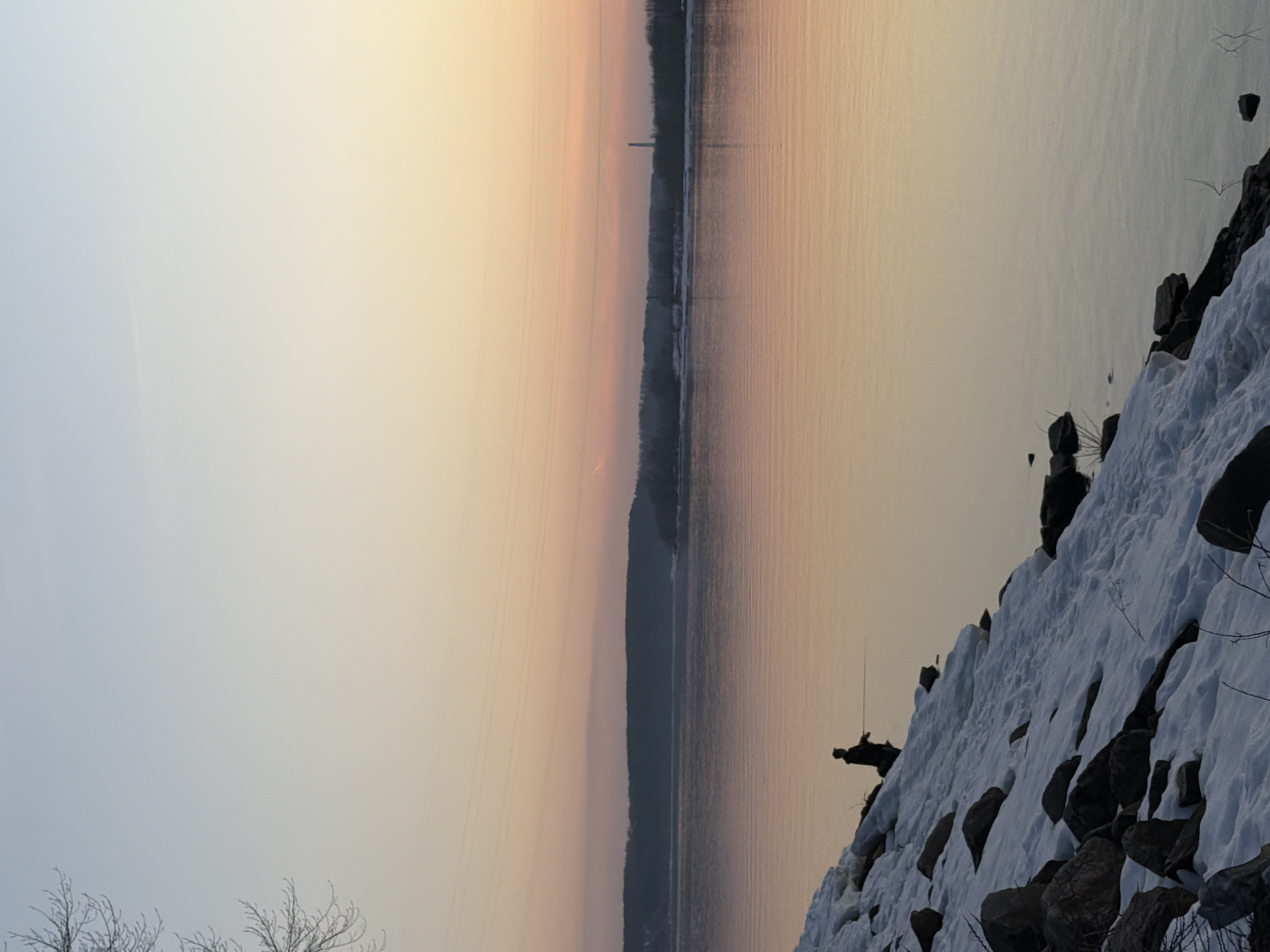 The image depicts a snowy shoreline next to a body of water at sunset or sunrise. Rocks are scattered along the shoreline. A person is silhouetted near the edge of the water, possibly fishing. Across the water, there is a strip of land with a tall structure visible on it. The sky is a mix of pale blues and pinks, indicating dawn or dusk. The image appears to be taken in a natural setting, possibly the outskirts of a town or city. Although this could be anywhere, it could very well be on the bank of the Kama River at Chaikovsky, Russia. There is no explicit detail given to definitively confirm its location.