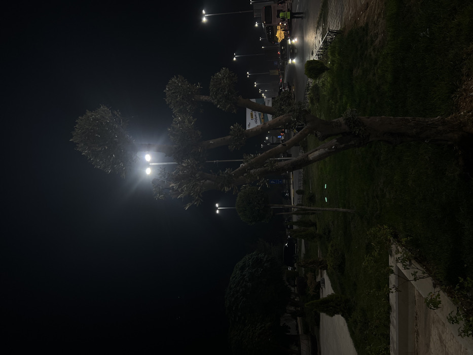 A nighttime scene featuring a stylized tree with trimmed, round foliage illuminated by streetlights. The dark sky contrasts with the light. In the background, streetlights line a road with distant vehicles. Green grass and manicured bushes border a paved path, hinting at a park-like setting. A low concrete wall edges the pathway. The image is taken with a slight tilt, emphasizing the tree's branches against the night sky.