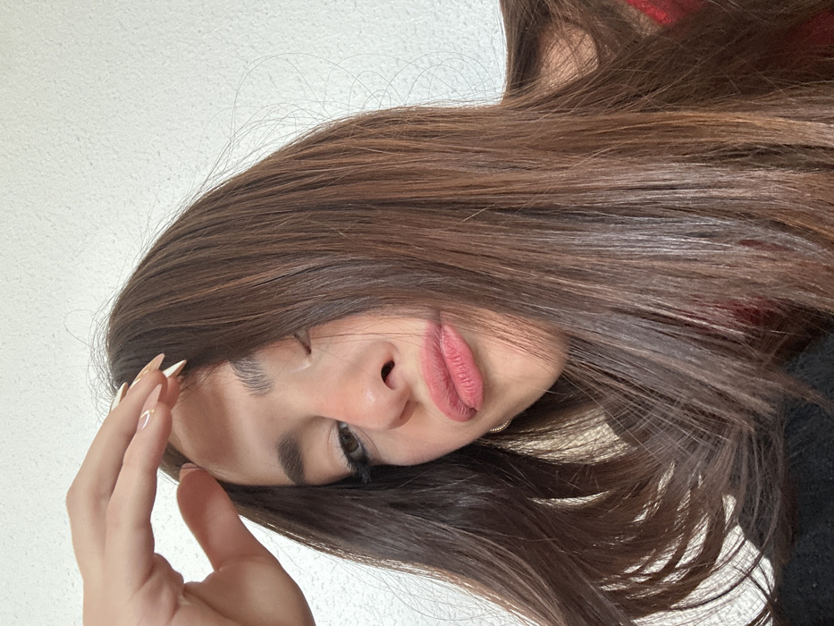 A close-up portrait depicts a female subject with long, straight, dark brown hair cascading over her shoulders and partially obscuring her face. Her right hand, featuring manicured nails with light polish and subtle gold accents, is positioned with fingertips resting on her forehead near her hairline. The subject's visible left eye appears partially closed or squinting, while her right eye is largely covered by her hair. Her lips are painted pink and are pursed in a distinct pout. Prominent eyelashes are visible. A dark garment is partially visible in the lower-left, and a hint of red fabric appears near the subject's right shoulder. The background is a plain, light-colored wall with a subtle textured finish. The specific location within Schiltigheim, France, is not identifiable from the visual content of the image.