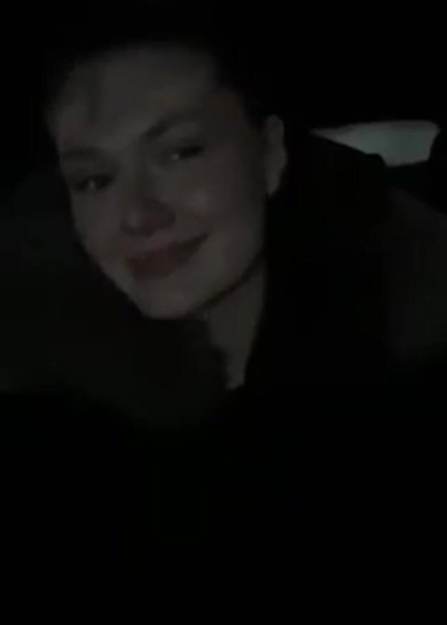 A woman in a dark parka with fur around the hood sits in dim light, possibly in a car, nodding her head to the music