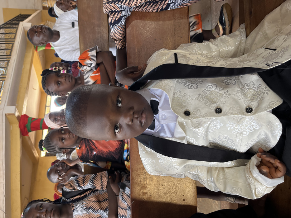 The image depicts an indoor gathering in Kuru Karama, Nigeria. The central subject is a young Black child, positioned front and center, wearing a cream-colored formal suit jacket with black lapels, a matching patterned vest, a white collared shirt, and a black bow tie. The child maintains a direct, serious gaze towards the camera. Behind this child, a diverse group of individuals, primarily children and some adults, are seated on wooden benches. To the left, a young female in a patterned dress with braided hair is partially visible, looking forward. Further back, several children with various hairstyles and patterned clothing are visible, some looking forward, others towards the camera's general direction. An adult male in white traditional attire is visible to the right, looking upwards and to the right. Other adults and children are present in the background, generally observing the scene. The environment features yellow-painted walls and pillars. Two pillars in the mid-background are adorned with red and green fabric wraps. An upper level or balcony with a dark railing is visible in the background, suggesting a larger hall or community space. The lighting is bright and even, indicating an illuminated interior. No specific actions or interactions beyond passive observation are clearly discernible among the background figures.