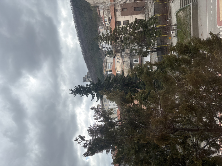 This image captures a wide exterior view of a city in Shumen, Bulgaria, specifically looking towards the Shumen Plateau under an overcast sky. In the background, the monumental Founders of the Bulgarian State structure is visible atop a densely forested hill (the Shumen Plateau). The hill slopes downwards, revealing a residential area composed of numerous buildings with predominantly red-tiled roofs, interspersed with multi-story apartment blocks featuring lighter facades. The midground and foreground are dominated by the dark green and brown foliage of several evergreen trees, which partially obscure the view of the urban landscape. Below the trees, a paved surface resembling a street or plaza is discernible on the right, featuring white markings and a red border. Adjacent to this, a section of an outdoor area, possibly a park or playground, is visible, containing benches, yellow metal structures, and a set of concrete steps leading downwards. The sky is uniformly overcast with shades of gray, indicating heavy cloud cover. No individuals or specific activities are observed within the frame.