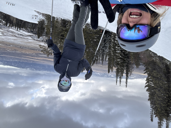 Two skiers at the top of a snowy mountain are captured in an upside-down image. The background features a valley, snow-covered hills, and a cloudy sky. The skier in the foreground wears a helmet, goggles, and ski gloves. A dark jacket and ski pants complete the attire of the second skier who's holding ski poles. The entire scene suggests a playful and adventurous day on the slopes.