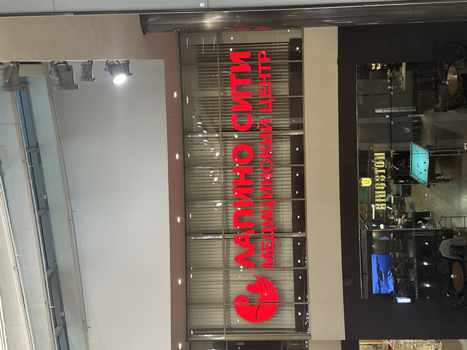 interior of a shopping mall in Moscow, Russia. The coordinates (latitude: 55.852, longitude: 37.482) place this location in the city of Moscow, specifically in the vicinity of the "Lapino City" medical center, as indicated by the prominent red sign in the image. The sign reads "Лапино Сити Медицинский Центр" ("Lapino City Medical Center"). The scene is captured from an elevated vantage point, overlooking a lower floor of the mall. In the foreground, a pool table is visible, with a few green balls scattered on the felt. To the right of the table, two chairs and a small table are arranged. A person appears to be standing near the pool table, facing away from the camera. In the background, a large screen is displaying a blurred image, likely a video advertisement. The ceiling of the mall is adorned with a network of metal beams. The lighting is fluorescent, casting a bright, white light over the scene. The walls are a neutral, light gray color.