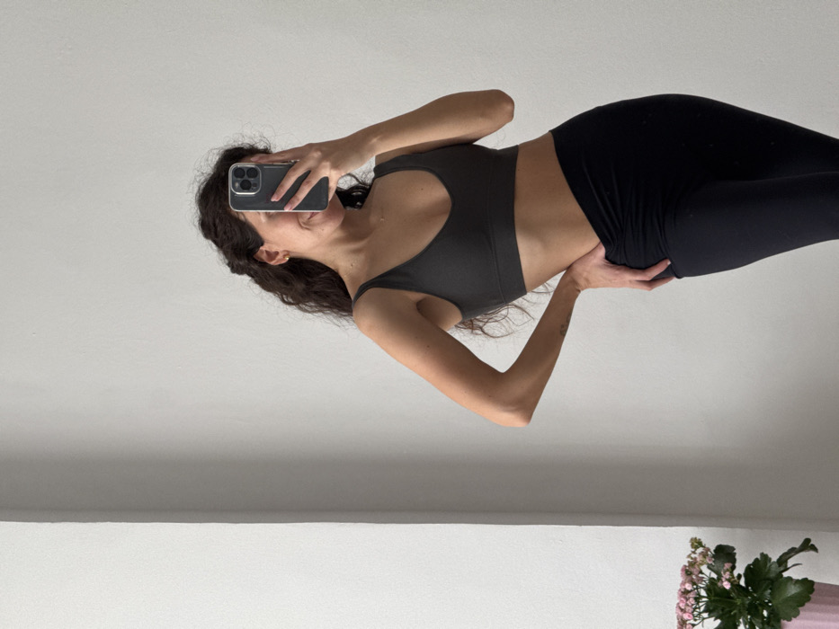 An interior image depicts a female subject taking a mirrored selfie, likely within a private residence in Palma de Mallorca, Spain. The subject, possessing long, dark, wavy hair, is dressed in a dark grey athletic bra and black high-waisted leggings featuring a twisted fabric detail at the front of the abdomen. Her right hand holds a dark-colored smartphone, possibly an iPhone with a clear case, positioned to obscure the upper right portion of her face; a partial smile is discernible. Her left hand is placed on her left hip. The background consists of a plain, light grey wall with a visible vertical corner seam on the left. In the lower left corner, a potted plant containing small pink flowers is partially visible within a light pink pot.