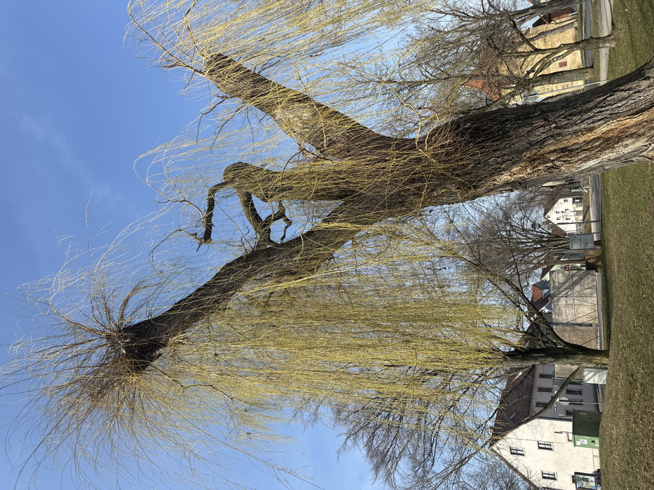 The image displays an outdoor urban landscape in Weißenburg in Bayern, Germany, under a clear blue sky with minimal cloud cover. A large, mature weeping willow tree dominates the foreground and mid-ground, positioned at an angle from the lower right to the upper left. Its thick, gnarled trunk is textured with deep furrows, and it branches into several main boughs. Numerous long, slender, flexible twigs hang downwards, exhibiting nascent yellow-green foliage consistent with early spring growth. Some branches at the top appear to have been heavily pruned or pollarded. The ground in the lower left consists of a grassy slope. Behind the willow, a paved road or path is visible, lined by several bare deciduous trees. To the left of the road, a light-colored, multi-story building with a reddish-brown tiled roof and multiple windows stands. In front of this building, two green utility boxes are positioned on the grass. To the right of the road, a wooden fence or barrier is partially visible, along with additional buildings in the background. One background building on the far right exhibits a reddish-brown turret or spire. No people or animals are present.