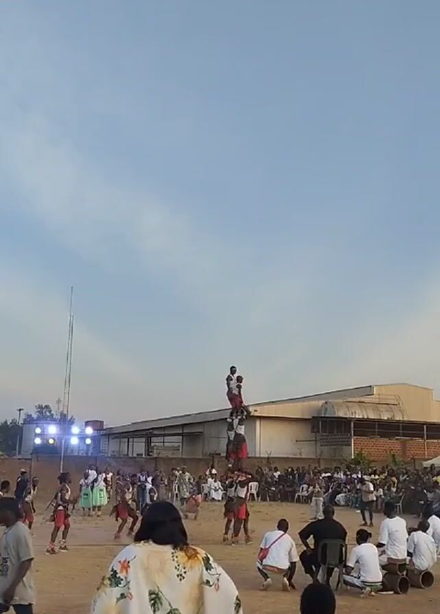 The video captures a scene of cultural performance and community gathering in an open outdoor space. The focus is on a group of performers, predominantly wearing red outfits, who have formed a human pyramid. The pyramid consists of multiple tiers of individuals standing on each other, creating a tall, stacked formation. Surrounding the performers is a sizable crowd of spectators, dressed in diverse casual clothing. Some members of the audience are seated on chairs, while others are standing. A group of people can be seen near the front of the crowd, possibly involved in recording or documenting the performance. In the background, there is a large industrial building, possibly a warehouse, with a low roofline. Next to it, there’s a metal tower. Bright stage lights are set up nearby. The sky above is clear and light blue. The video is shot from a lower angle, looking up at the performers and the surrounding environment.