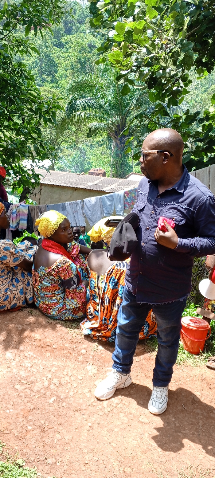 A man wearing a blue button-down shirt, blue jeans, and white sneakers stands on a dirt ground amidst lush greenery. He holds a black baseball cap in his left hand and a red object in his right. Seated nearby are several women in vibrant patterned dresses and headscarves. In the background, a building with a corrugated metal roof is visible, with clothes hanging on a line. A red bucket sits near the man's feet.