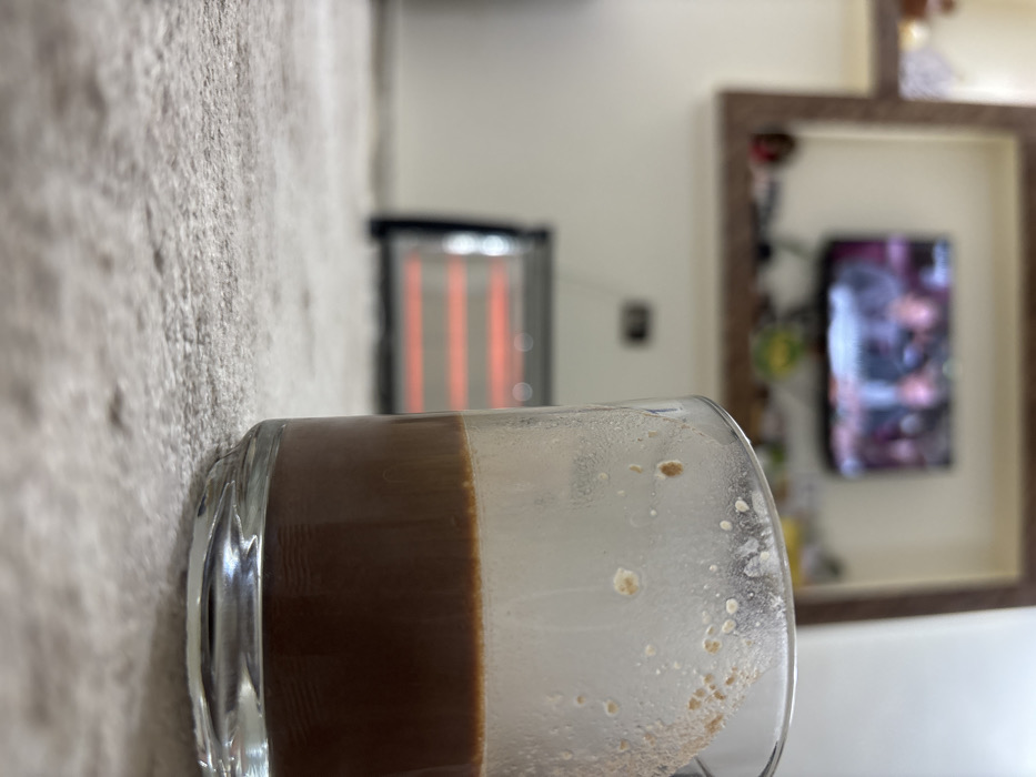 The image depicts an indoor residential scene in Mu'adammiyat ash-Sham, Syria. In the immediate foreground, a clear glass, approximately half-filled with a dark brown liquid, rests on a light-colored, textured floor surface resembling carpet. The interior of the glass above the liquid line exhibits residue and small bubbles. In the midground, an activated dark electric radiant heater is visible on the floor, displaying three glowing red elements. An electrical outlet or switch is mounted on the light-colored wall above the heater. The background features a wall-mounted television displaying blurred human figures. Below the television, a wooden-framed wall niche contains indistinct objects. No individuals are directly present in the observable space beyond the blurred figures on the television screen.