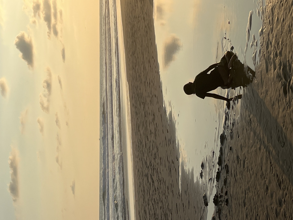 The image depicts a beach scene in Kabalana, Sri Lanka, during either sunrise or sunset, characterized by a warm, golden-orange sky with scattered light clouds. The sky transitions into the ocean horizon, where a small, dark vessel is visible in the distance. Multiple waves are breaking and receding on the shore. In the foreground, a sandy beach features a large, irregular shallow pool of water that reflects the sky and clouds. A single individual, appearing to be a child or young person, is silhouetted in the lower right quadrant. They are dressed in a dark short-sleeved top and dark shorts, crouching or sitting on the wet sand at the edge of the reflective water pool, facing towards the ocean with their back partially to the viewer. Their right hand extends towards the water or sand directly in front of them, suggesting interaction with the immediate environment. The wet sand shows varied textures and small mounds, likely from water movement.