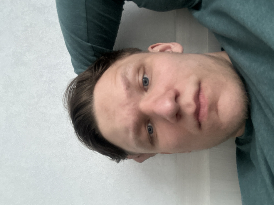 A close-up, vertically oriented portrait depicts a Caucasian male. The individual, positioned centrally, has short, dark brown hair styled with a part on his left side, blue eyes, a prominent nose, and visible light stubble on his chin and jawline. His facial expression is neutral. He is wearing a long-sleeved garment of teal or dark green color. His left arm is bent, with his left hand partially visible behind his head, supporting his posture. The background consists of a plain, light-colored, subtly textured wall. The image appears to be a self-portrait taken from a slightly low angle. The specific location within the city of Perm, Russia, cannot be determined from the visual information present in the image.