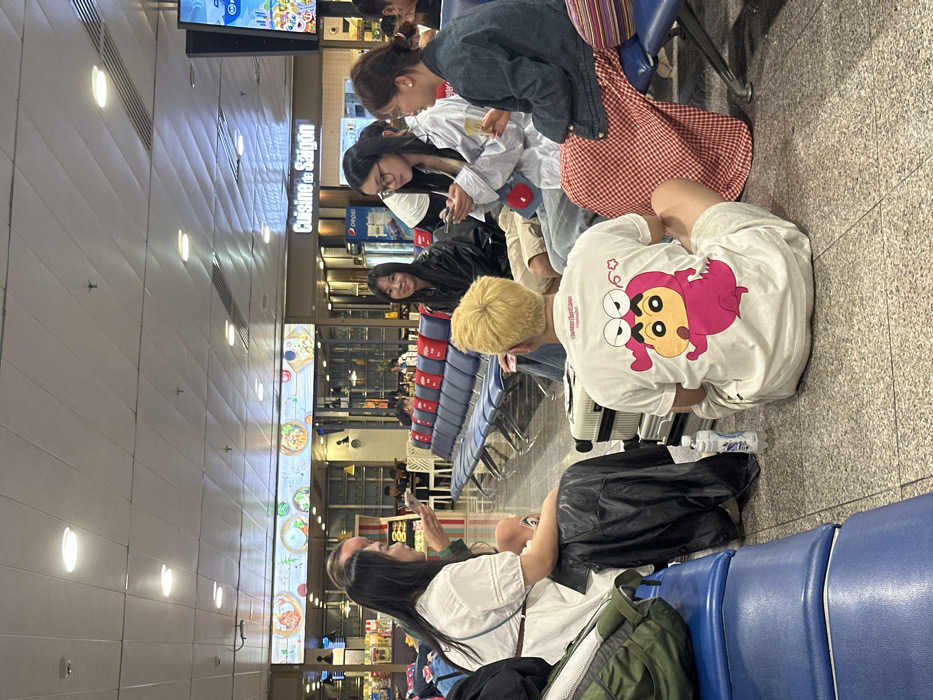 Several people are seated in an airport waiting area. Some sit on blue plastic chairs, while one person is on the floor with a cartoon-printed white shirt. A group appears to be looking at a phone. A restaurant or cafe is visible in the background with bright menus. The ceiling is high, with rows of lights. Luggage and personal belongings are scattered around.