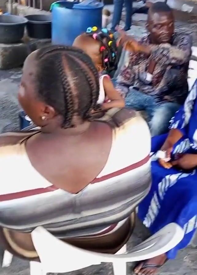 four people sitting in a casual outdoor setting. A woman with braided hair sits with her back to the camera, wearing a horizontally striped top. A young girl with colorful hair accessories is visible between her and a man who is braiding the girl's hair. The man is wearing a patterned shirt and jeans. To the right of the man, a woman in a blue and white patterned dress sits and appears to be talking. The background includes various objects such as blue barrels, black tubs, and metal fencing, suggesting an outdoor area like a courtyard or a public space. People walk by in the background, indicating a relatively busy environment.