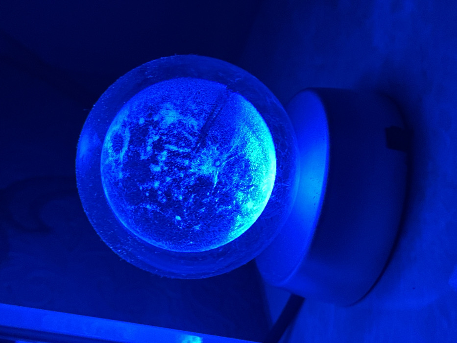A round, blue nightlight illuminates a dimly lit room. The light source appears to be a textured globe within a transparent, slightly larger sphere. This assembly sits on a cylindrical base mounted to a wall. The blue glow casts shadows and bathes the surrounding surfaces in a cool, uniform light. A switch is visible on the side of the base.