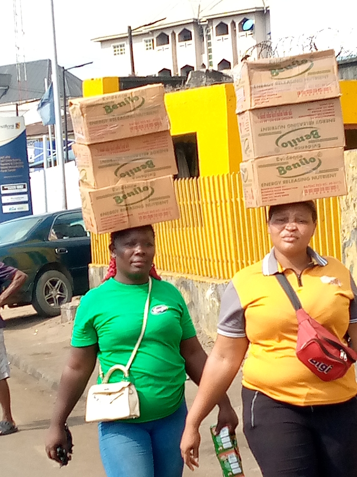 The image depicts an outdoor urban street scene in Aba, Nigeria, under bright daylight. Two adult females are walking side-by-side, each balancing three stacked, rectangular, light-brown cardboard boxes on their heads. The boxes are labeled with "Benilo" and "ENERGY RELEASING NUTRIENT." The woman on the left has a dark complexion, wears a green short-sleeved t-shirt, light blue jeans, and red braided hair. She carries a small, light-colored handbag with a shoulder strap across her body and holds a dark object in her right hand. The woman on the right has a slightly lighter complexion, wears a yellow short-sleeved polo shirt with grey collar and sleeve details, and black pants. She wears a red fanny pack across her chest and holds two small, green-packaged items in her left hand. In the background, a bright yellow slatted barrier or wall is visible, behind which stands a multi-story building with a light-colored facade featuring multiple arched windows. To the far left, a dark green sedan is partially visible, parked on the street next to a curb. A portion of a blue and white commercial sign is also visible on the left, along with a partial view of a third individual's leg and arm wearing sandals and shorts. The immediate ground appears to be paved.