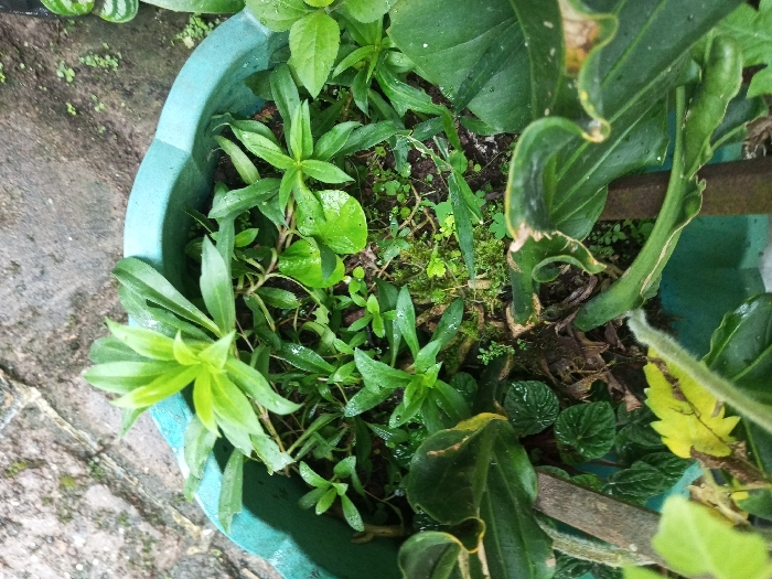 A close-up captures a green, cyan-painted pot teeming with mixed vegetation. Varied leaf shapes and sizes are present: large, crinkled, and light-veined; smaller, smoother, rounded; and slender, lance-like leaves arranged in starburst formations. The plants are closely packed. The soil surface is partly obscured by the dense foliage and patches of tiny moss-like growth. A section of grey patterned pavement is visible behind the pot.