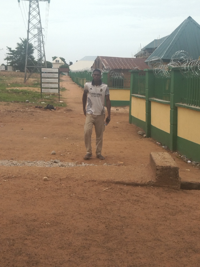 man standing in a dirt path between two rows of buildings in Asuir, Nigeria. He is wearing a white t-shirt with the words "Emirates fly better" on it and brown pants. He is looking directly at the camera. The path is dusty and there are some rocks and debris on the ground. There is a tall power line behind him, and a sign with text on it. The buildings behind him are made of brick and have green metal roofs and barbed wire fences. The buildings are relatively new, and there is some vegetation on the ground. The location is at a latitude of 7.684 and a longitude of 8.536. The man is standing in a space between a row of buildings with green metal roofs and barbed wire fences and a row of buildings with yellow walls and green trim. There is a small concrete step in the lower right hand corner of the picture.