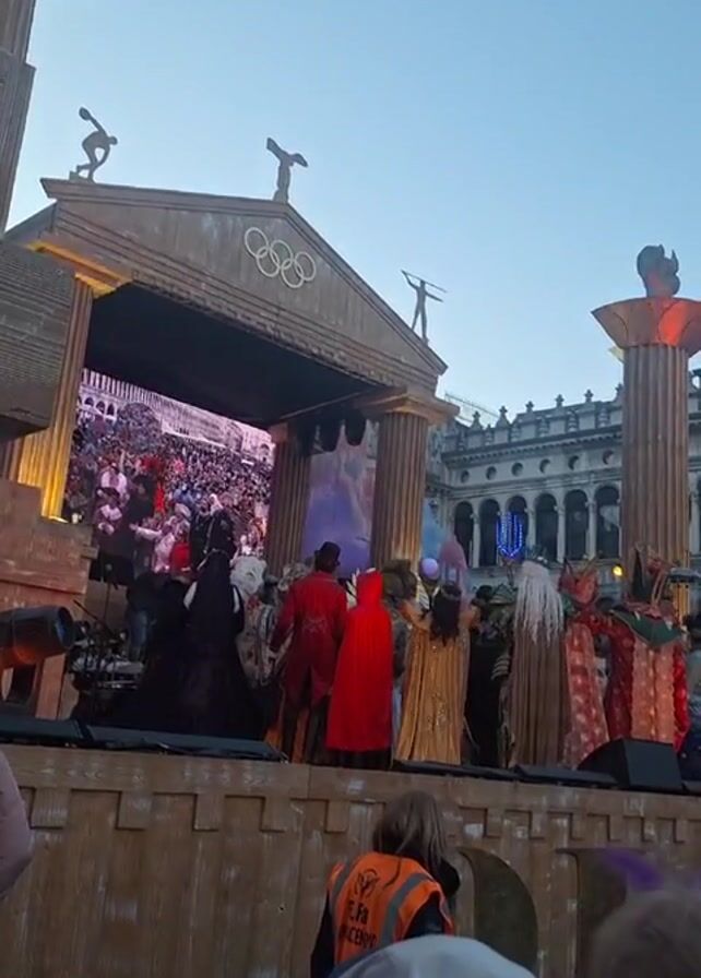 people in elaborate costumes standing on a platform in front of a large crowd. The platform resembles an ancient Greek temple, complete with columns and statues. The crowd is visible on a large screen behind the performers. A person wearing an orange vest stands near the camera. The sky is a clear blue.