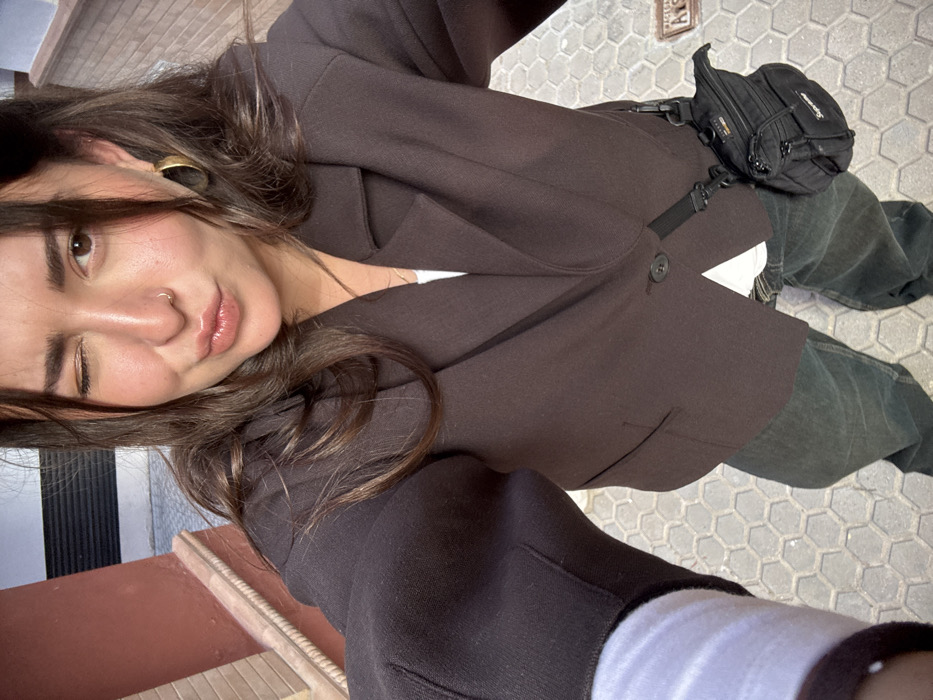 A woman poses for a selfie, winking. She has brown hair, a nose ring, and large hoop earrings. She wears a brown blazer, a white undershirt with long sleeves, and jeans. A black fanny pack is visible. The background shows a patterned sidewalk and part of a building.
