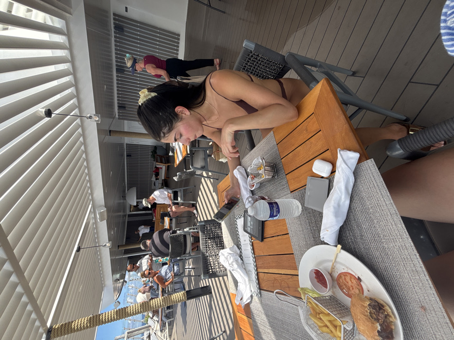 The scene depicts an outdoor dining or lounge area on a cruise ship or resort deck overlooking the ocean. The location is not identifiable as a specific city in Cuba, but rather a maritime or coastal leisure environment. In the foreground, a young woman with dark hair, pulled back in a ponytail secured with a yellow scrunchie, is seated at a rectangular wooden table. She wears a dark brown bikini top and bottom. Her gaze is directed downward at a dark electronic tablet or phone she holds with both hands. On the table, to her left, rests a white plate containing a partially consumed hamburger with a tomato slice and a side of french fries in a metal basket, accompanied by a small dish of ketchup. Also on the table are a clear plastic water bottle, a small grey rectangular object, a white Apple AirPods case, a folded white napkin, and a metal condiment holder. The photograph is taken from the perspective of another person seated opposite her, whose legs are visible in the lower frame, one foot wearing a dark sandal with a gold buckle. The area is shaded by a white slatted overhead structure, allowing sunlight to cast strong striped shadows across the dark flooring. In the midground to the left, several individuals are seated at tables. A man in a light shirt stands, observing the surroundings. Near him, a woman with sunglasses on her head is seated. Further back, a man with a striped shirt is seated with his back to the viewer, and another man in a white shirt and cap is seated looking down. In the midground to the right, a woman with blonde hair, wearing a dark red tank top and dark pants, stands with her back partially to the camera, looking towards the right. White, rope-wrapped pillars support the overhead structure, and contemporary light fixtures hang from it. The background reveals an expanse of blue ocean, separated by a railing, and what appear to be deck loungers to the far left.