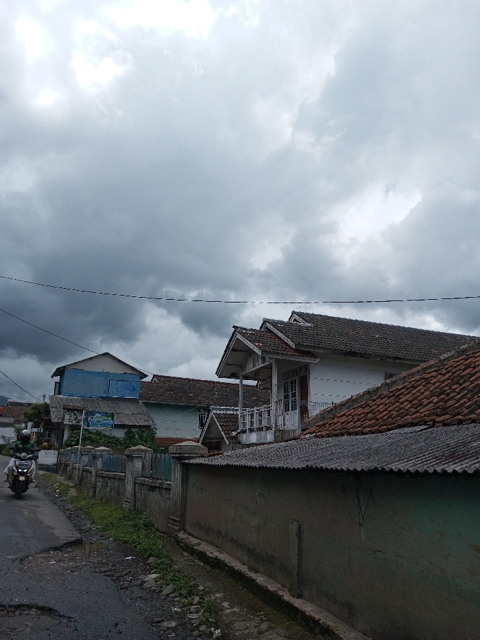 This image depicts a residential street scene under a heavily overcast, grey sky, located in Ganja City, Azerbaijan. In the immediate foreground on the right, a low, muted green-grey concrete wall is topped with dark corrugated roofing. Adjacent to the road, a narrow strip of dirt and sparse vegetation runs alongside a small concrete drainage channel. The paved asphalt road in the left foreground exhibits numerous cracks and potholes, with visible puddles. A single individual wearing a dark helmet and a light-colored jacket is riding a white scooter/motorcycle on the left side of the road, moving away from the viewer towards the background. Several houses line the street. Prominently featured on the right is a white two-story house characterized by a complex gabled roof system covered in reddish-brown clay tiles. The second story includes a distinct white balcony or veranda with vertical railings and multi-pane windows. The exterior walls of this house show signs of wear and weathering. To the left of this structure, a light blue two-story house with a flatter, dark-colored roof is visible. A faded mural or sign is present on its lower exterior wall, partially obscured by green climbing foliage. In front of the blue house, a concrete fence with decorative pillars stands. Black utility lines stretch horizontally across the upper-mid section of the frame. Distant hills or mountains are faintly visible on the horizon under the heavy cloud cover.